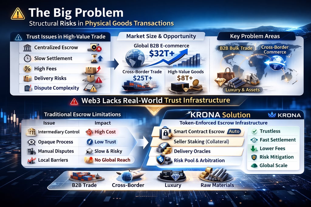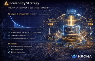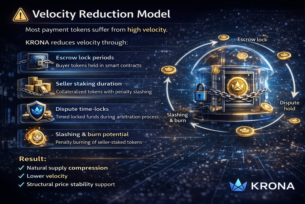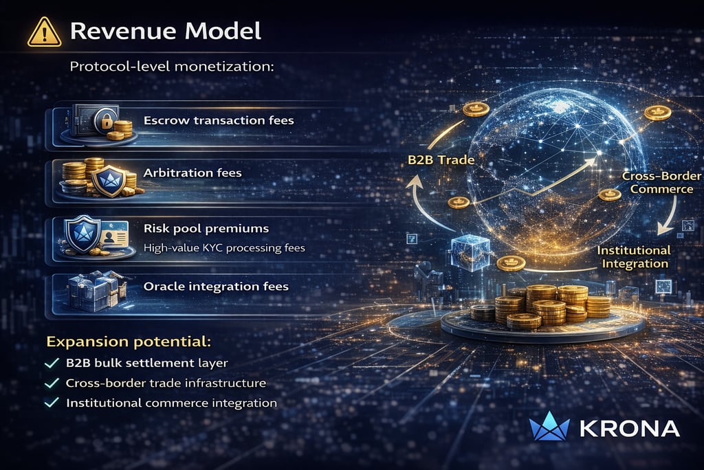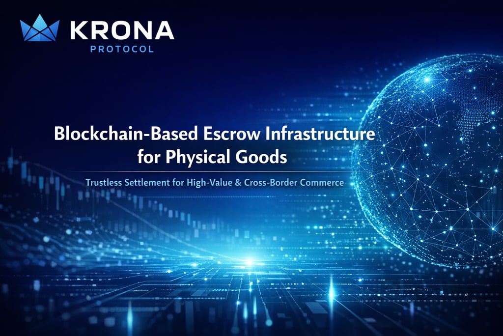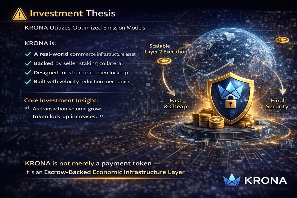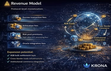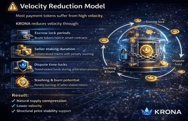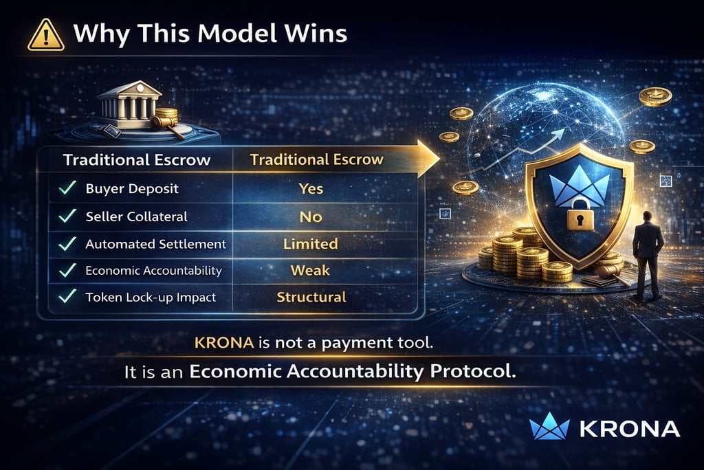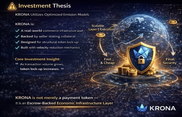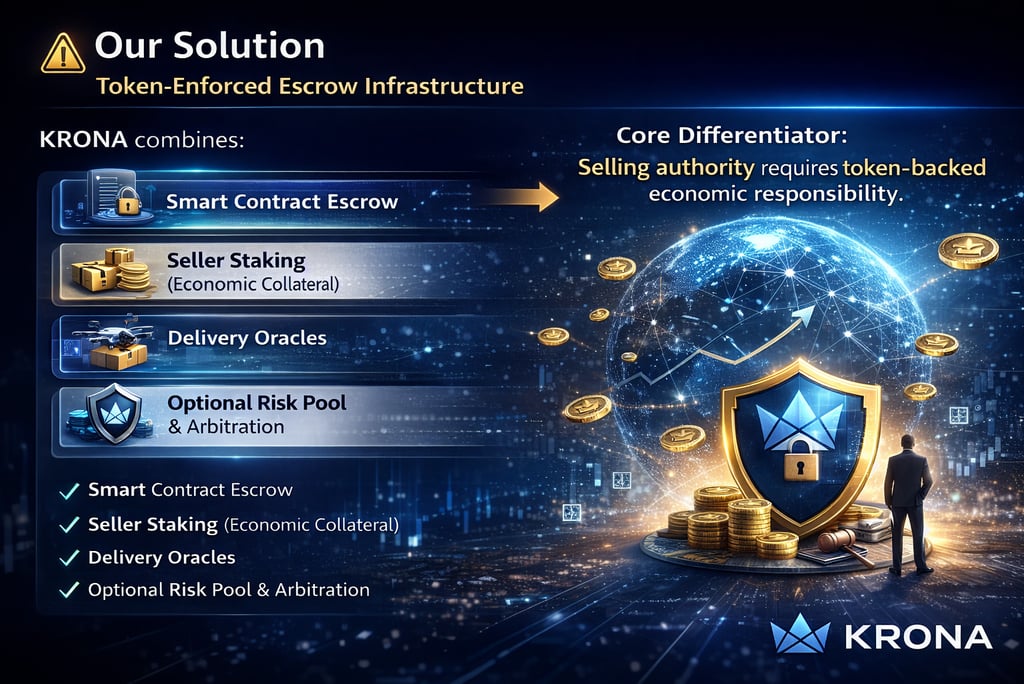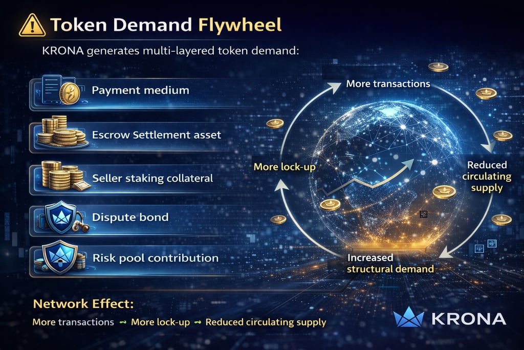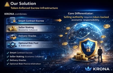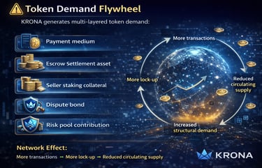 KRONA Token functions as a utility token for payment, escrow, staking, and risk control, enabling automated settlement, economic accountability, and global scalability for real-world commerce.